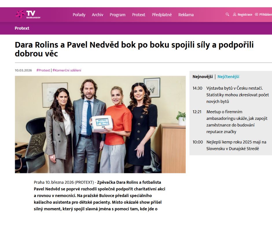 Zpěvačka Dara Rolins a fotbalista Pavel Nedvěd se poprvé rozhodli společně podpořit charitativní akci a rovnou v nemocnici. Na pražské Bulovce předali speciálního kašlacího asistenta pro dětské pacienty. Místo okázalé show přišel silný moment, který spojil slavná jména s pomocí tam, kde jde o dětské zdraví.