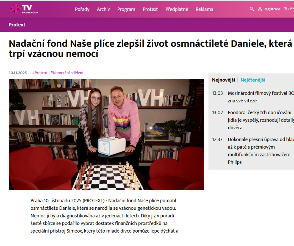 TV Barrandov: Nadační fond Naše plíce zlepšil život osmnáctileté Daniele, která trpí vzácnou nemocí